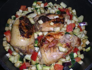 ZELENJAVO (bučka, paprika, jajčevec) OPEREMO, OČISTIMO IN NAREŽEMO NA KOCKE. DODAMO PIŠČANČJEMU MESU TER PRAŽIMO ŠE cca 10min.
